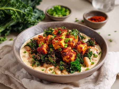 Bohnen in Mais-Sauce mit Grünkohl und BBQ-Tofu