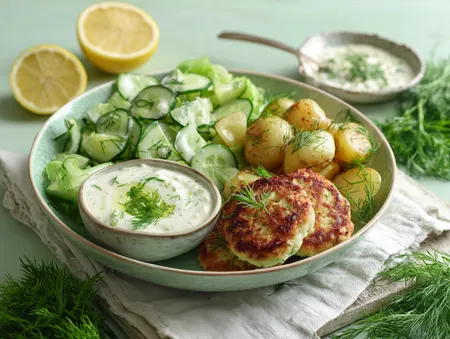 Fischfrikadelle mit Salzkartoffeln und Joghurt-Dip