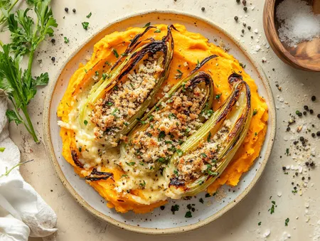 → Ein ungewöhnliches, aber raffiniertes Ofengericht. Chicorée und Kürbis sind jetzt gut verfügbar und liefern eine spannende Textur.