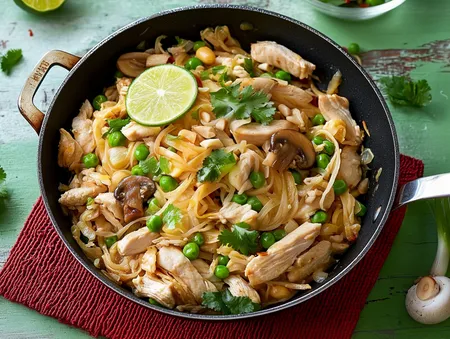 Samstag: Reisbandnudel-Pfanne mit Hähnchen und Chinakohl