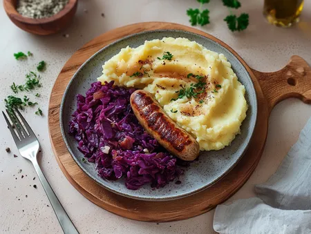 Donnerstag: Bratwurst mit Kartoffel-Blumenkohl-Stampf und Birnen-Rotkohl